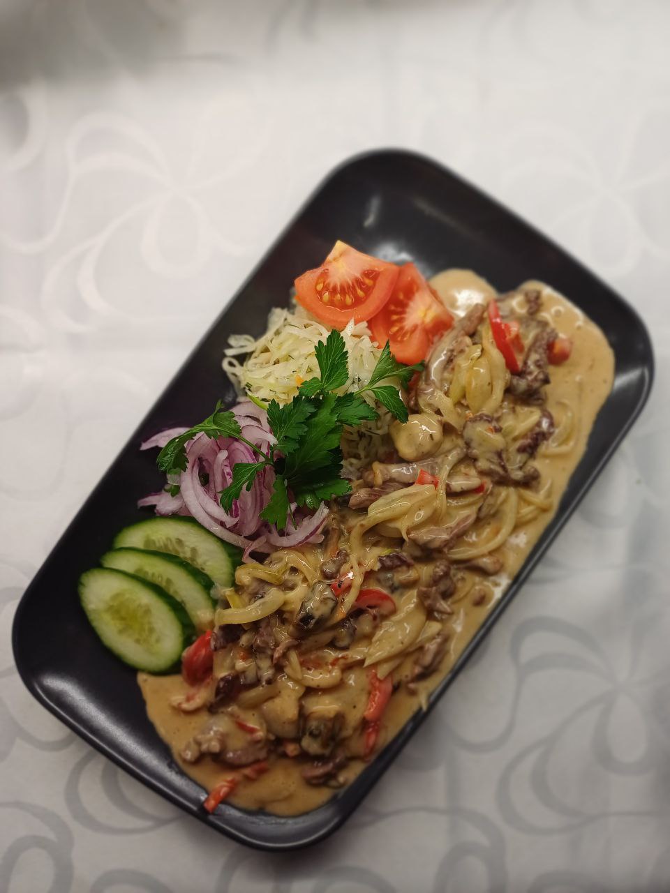 NoliktavāBefstroganovs — klasiskās krievu virtuves ēdiens, kas sastāv no maigiem liellopa gaļas gabaliņiem, kas sautēti krēmīgā mērē ar sīpoliem, sēnēm un garšvielām. Tas tiek pasniegts ar rīsiem vai kartupeļiem, radot sātīgu un aromātisku maltīti, kas lieliski apvieno bagātīgas garšas un maigu tekstūru. Befstroganovs ir lieliska izvēle gan ikdienas vakariņām, gan svinīgām reizēm.