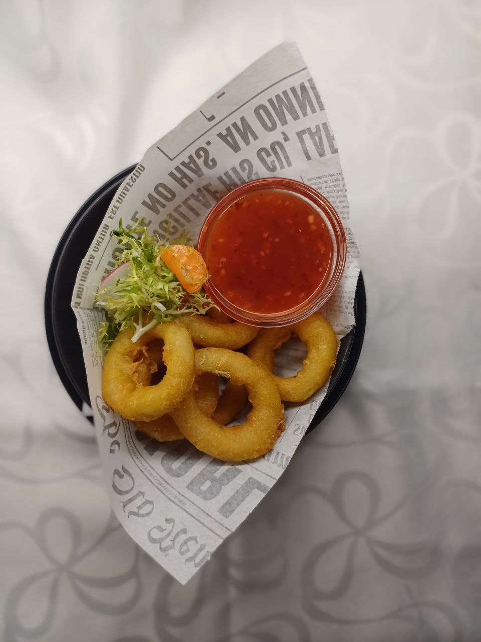 zbaudiet mūsu klasiskos, krāsnī ceptos kalmāru gredzenus, kas pasniegti ar mūsu speciālo mērci. Ideāla uzkoda vai salāti.